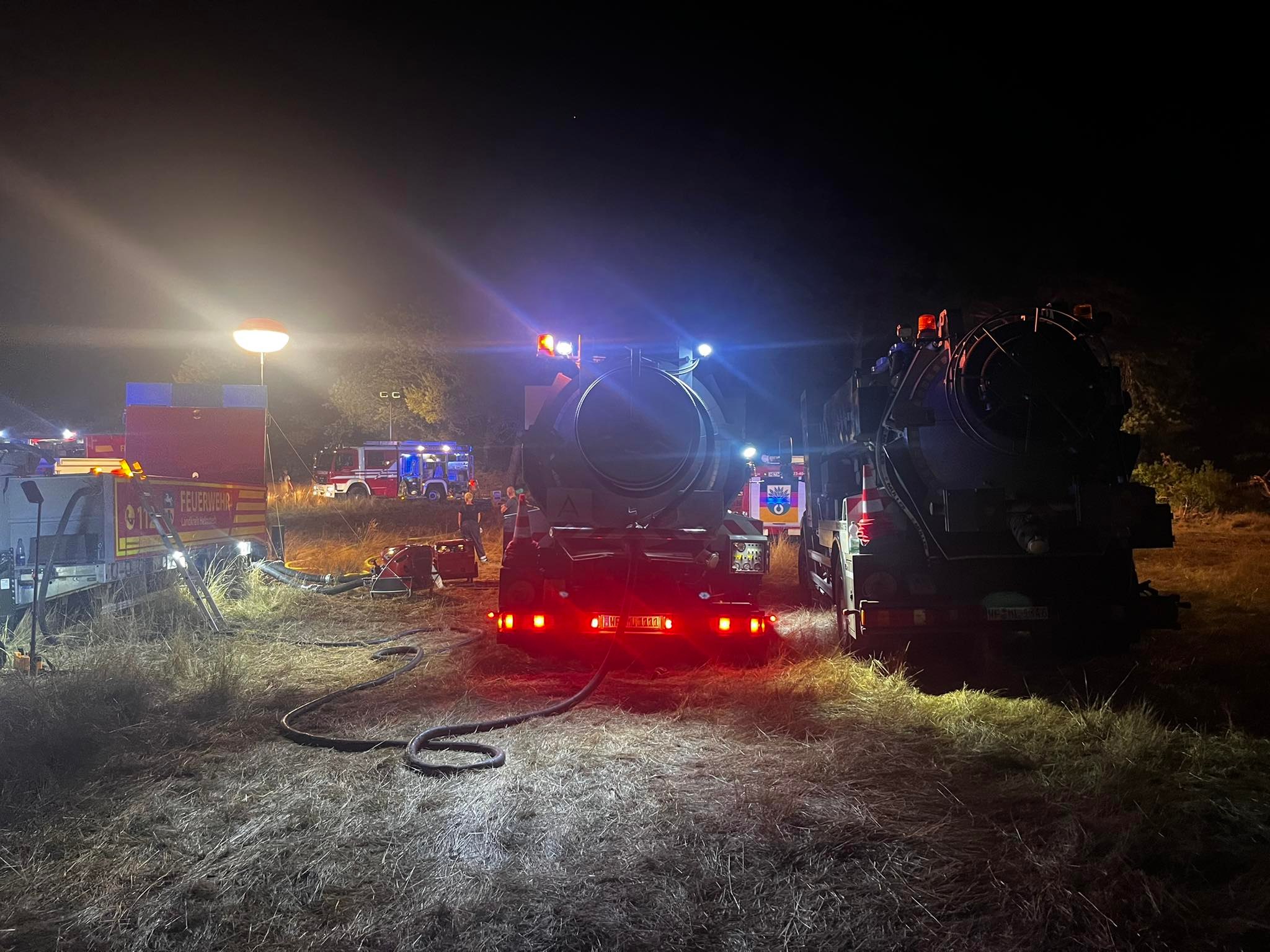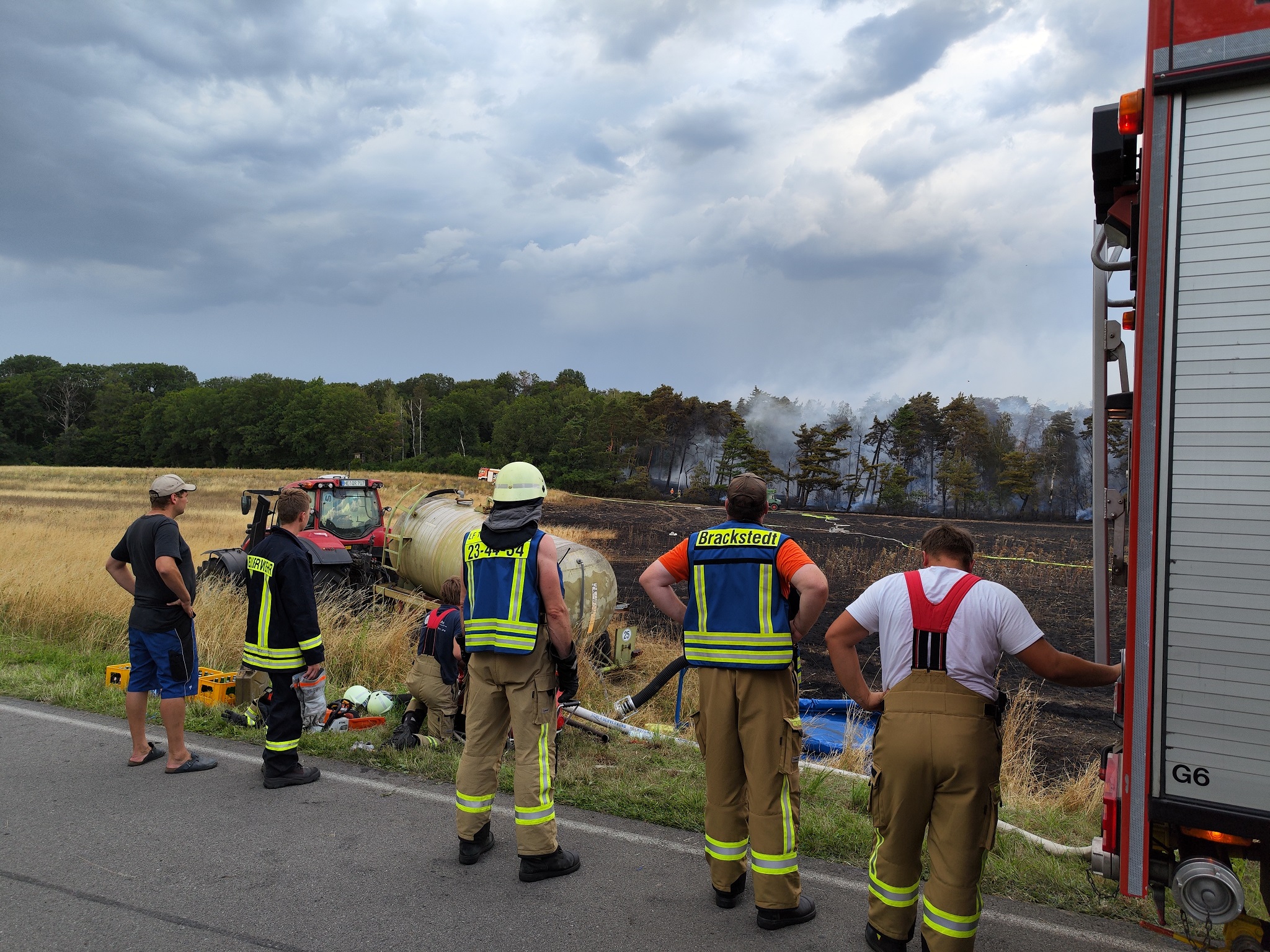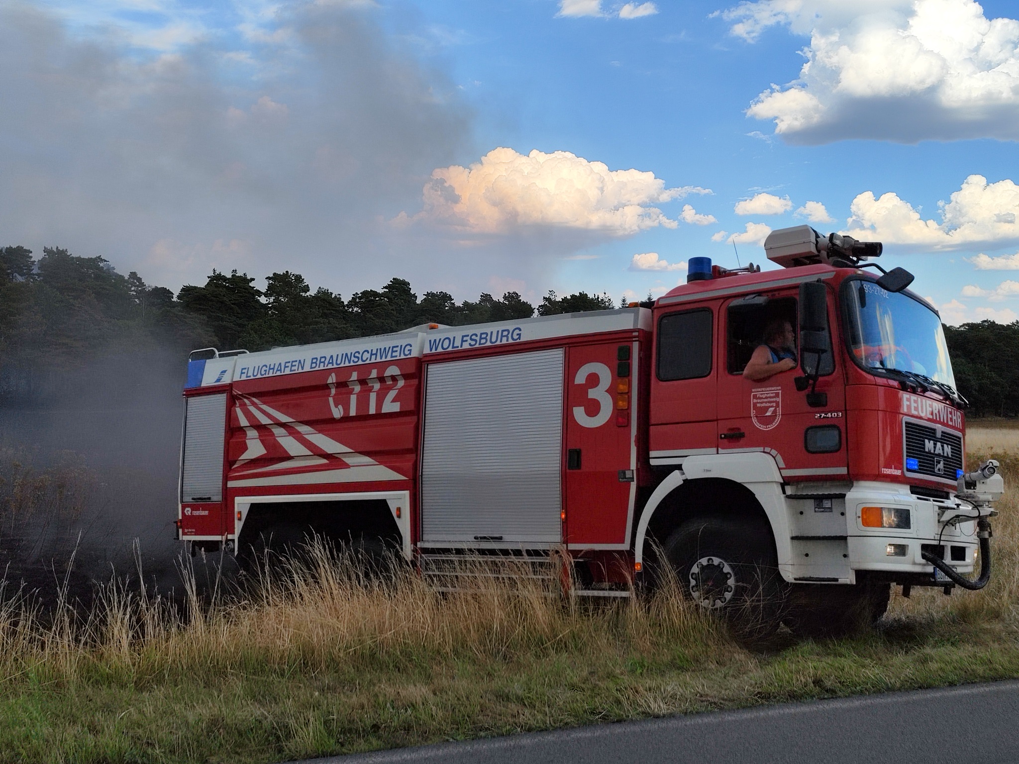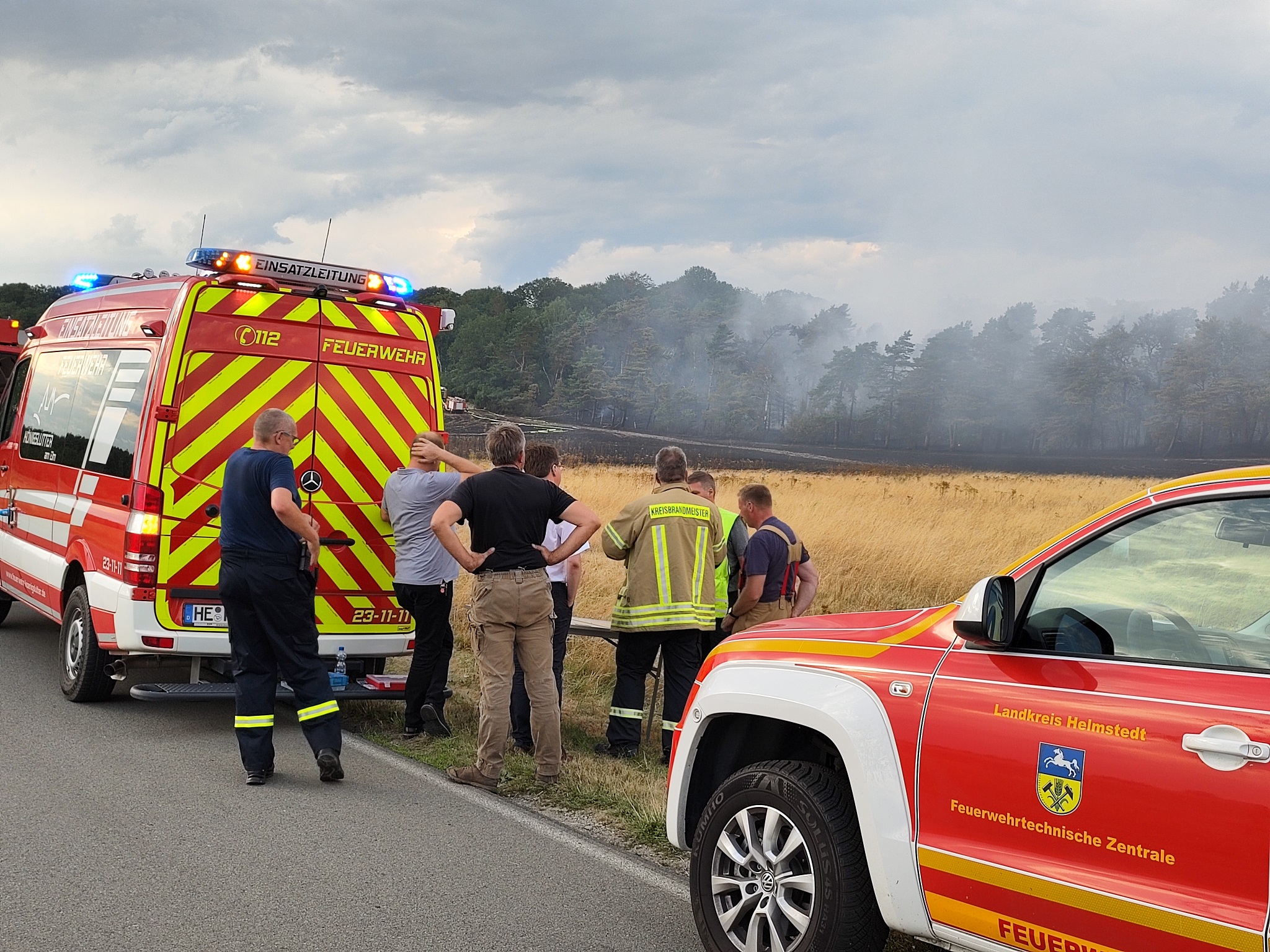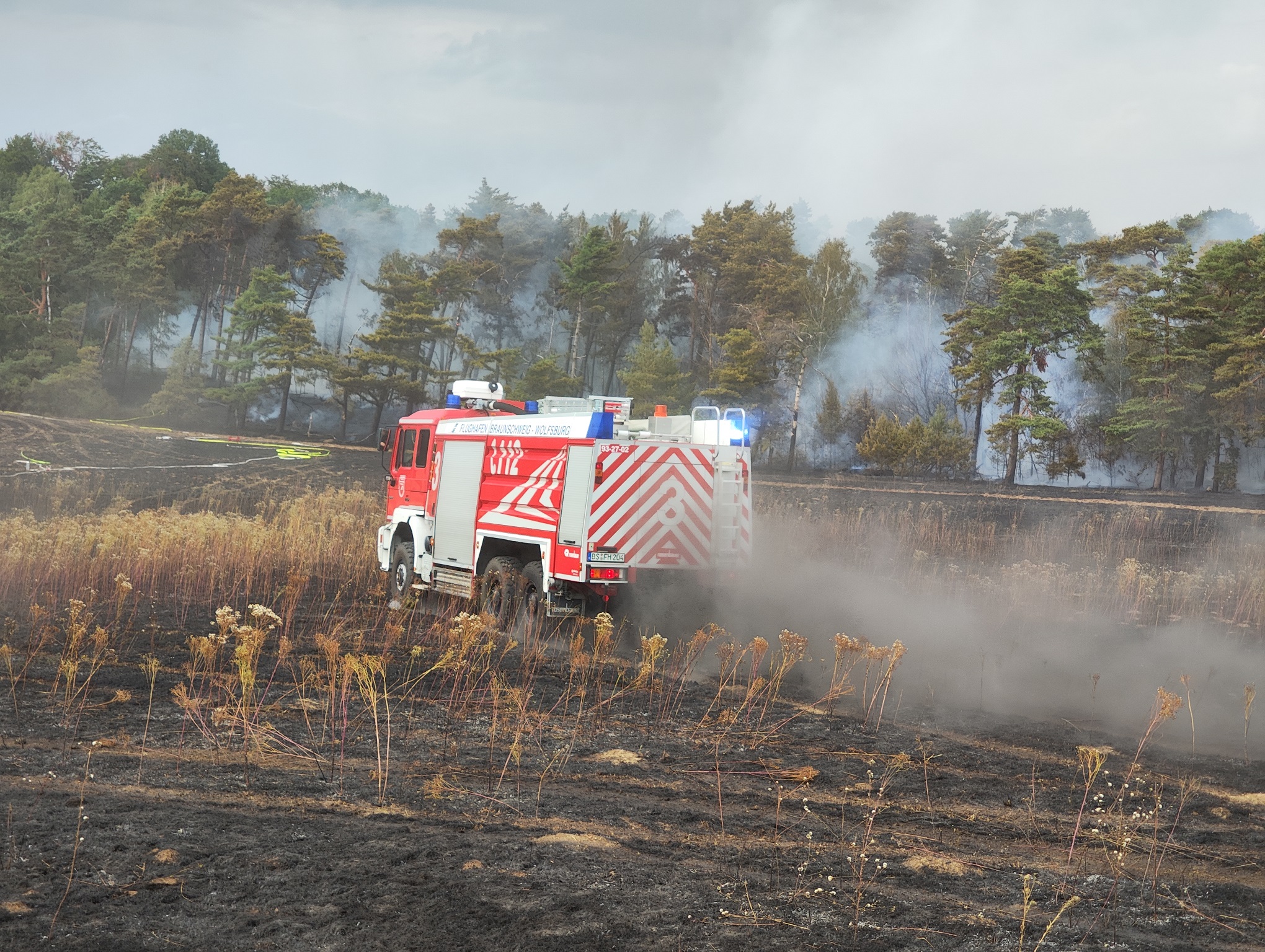 Neben den verschiedensten Wehren aus den umliegenden Dörfern war auch die Feuerwehr des Landkreises vor Ort. Ein Tanklöschfahrzeug des Flughafens Braunschweig-Wolfsburg sowie Feuerwehren aus dem Bereich Wolfsburg unterstützen ebenfalls. Später war auch die Schnell-Einsatz-Gruppe (SEG) des Arbeiter Samariter Bundes Helmstedt vor Ort. Die Helmstedter Kreisfeuerwehr flog das Gebiet mit einer Drohne ab, um sich ein Bild von oben machen zu können. Später traf auch ein Polizeihubschrauber ein, der den Einsatzleiter mit an Bord nahm um diesem einen noch besseren Blick zu gewähren. Landrat Herr Radeck und der neue erste Kreisrat Torsten Wendt machten sich ebenfalls ein Bild direkt vor Ort. Neben den zahlreich unterstützenden Landwirten aus der Umgebung, waren auch zwei Tanklaster der Firma Lang Mineralöle aus Sickte mit vor Ort. Beide Lastkraftwagen konnten mit Ihrer Saugdrucktechnik das Wasser der Tanks direkt in die Pumpen der Feuerwehrautos einspeisen, sodass das Löschen hier direkt unterstützt werden konnte. Beide LKW zusammen fassen ein Wasservolumen von insgesamt ca. 20.000 Liter Wasser. Es ist sehr schön zu sehen, dass die Gemeinschaft innerhalb und außerhalb des Landkreises Helmstedt sehr gut funktioniert und neben den unzähligen freiwilligen Feuerwehrkräften so viele Freiwillige aus der Zivilbevölkerung spontan geholfen haben. ![]() ![]() Auf Grund der langanhaltenden Trockenheit wird von einer erweiterten Einsatzlänge ausgegangen. Zwischen 18 und 19 Uhr drehte der Wind, sodass der Qualm in Richtung der Einsatzkräfte wehte. Immer wieder loderten auf dem aschebedeckten Waldboden Flammen auf. Vor Ort sind mehr als 200 Kräfte im Einsatz. Unter folgendem Link ist das Youtube-Video zum Einsatz zu sehen: ![]() ![]() ![]() ![]() ![]() ![]() ![]() ![]()
