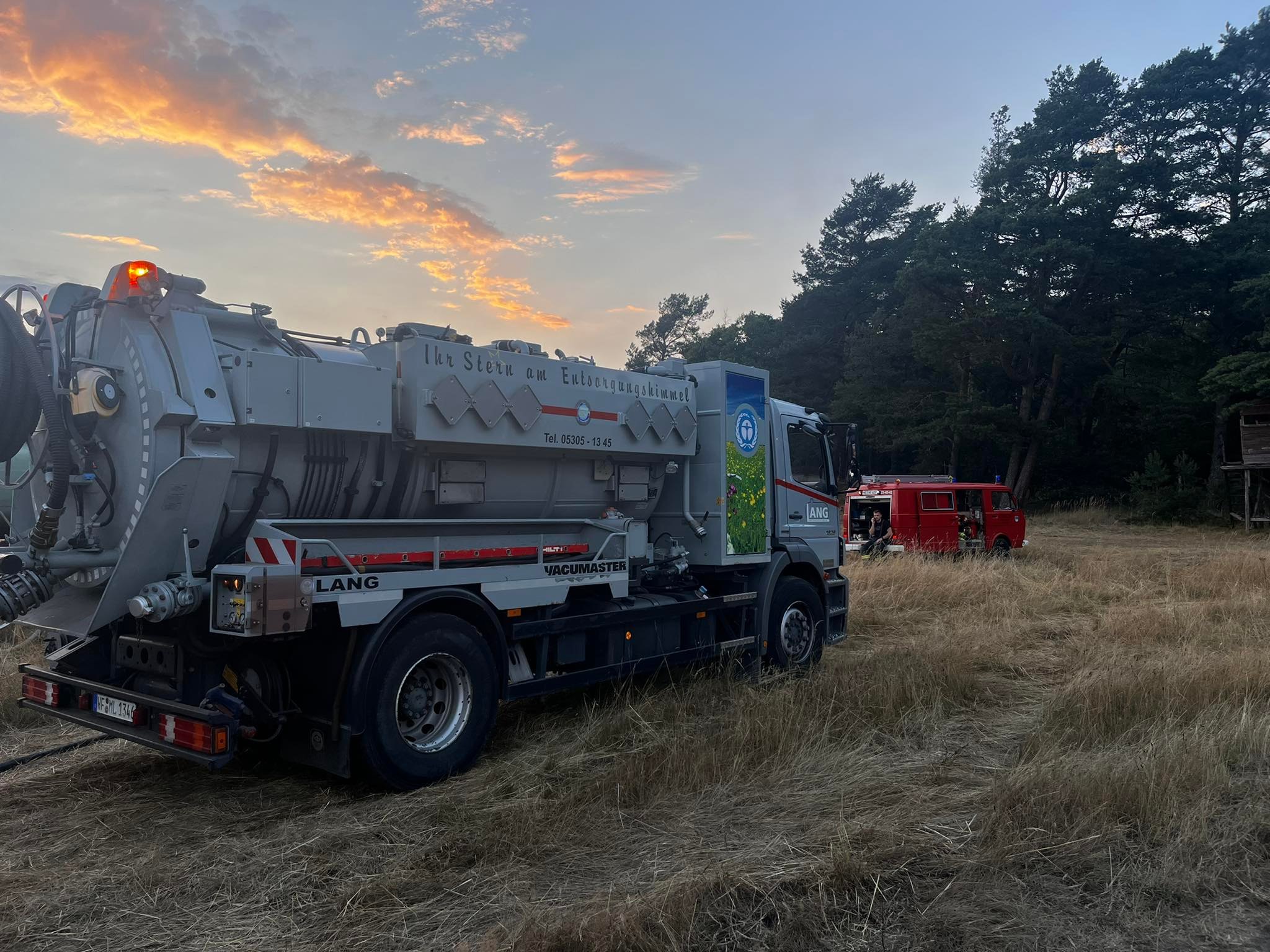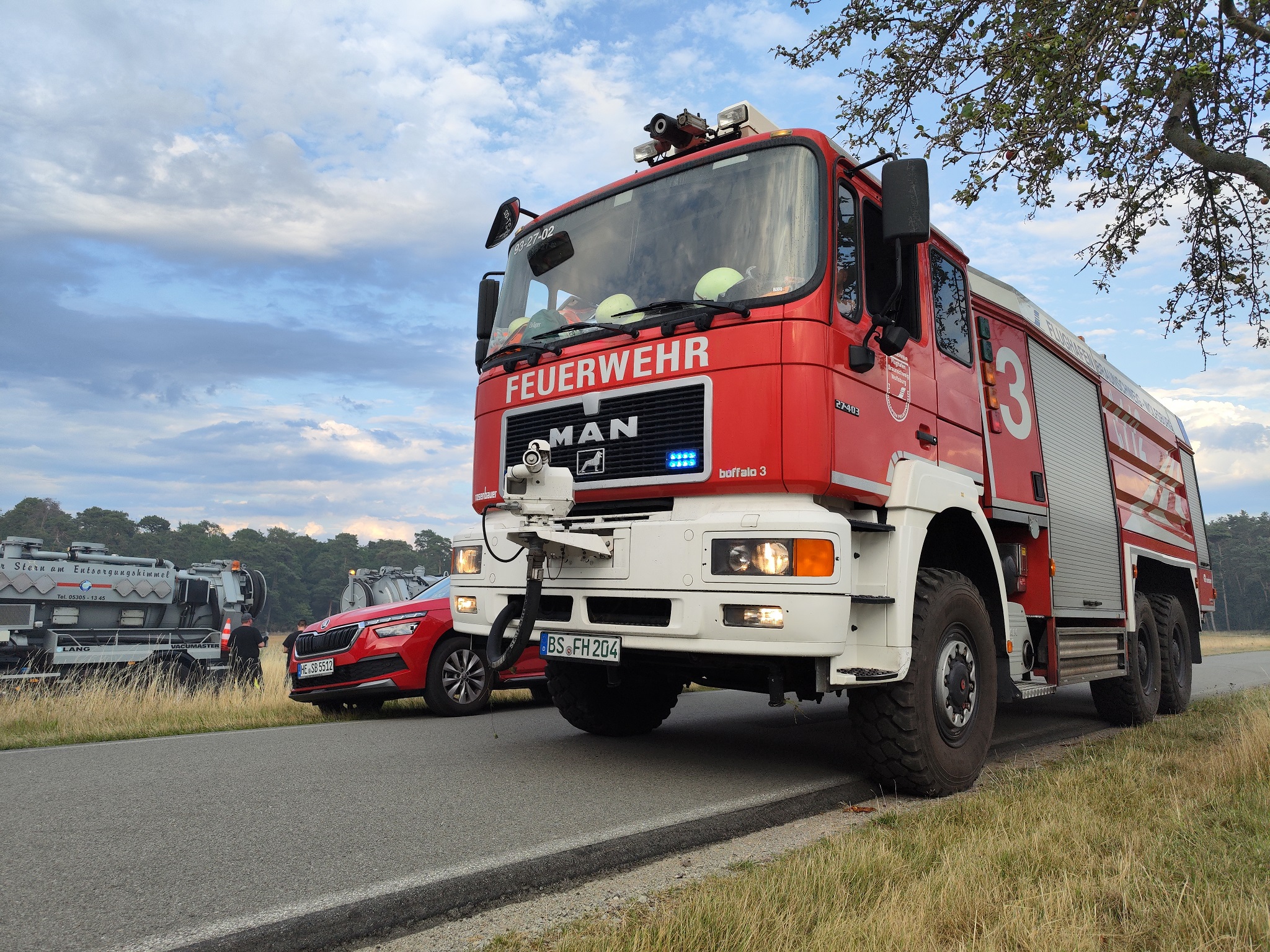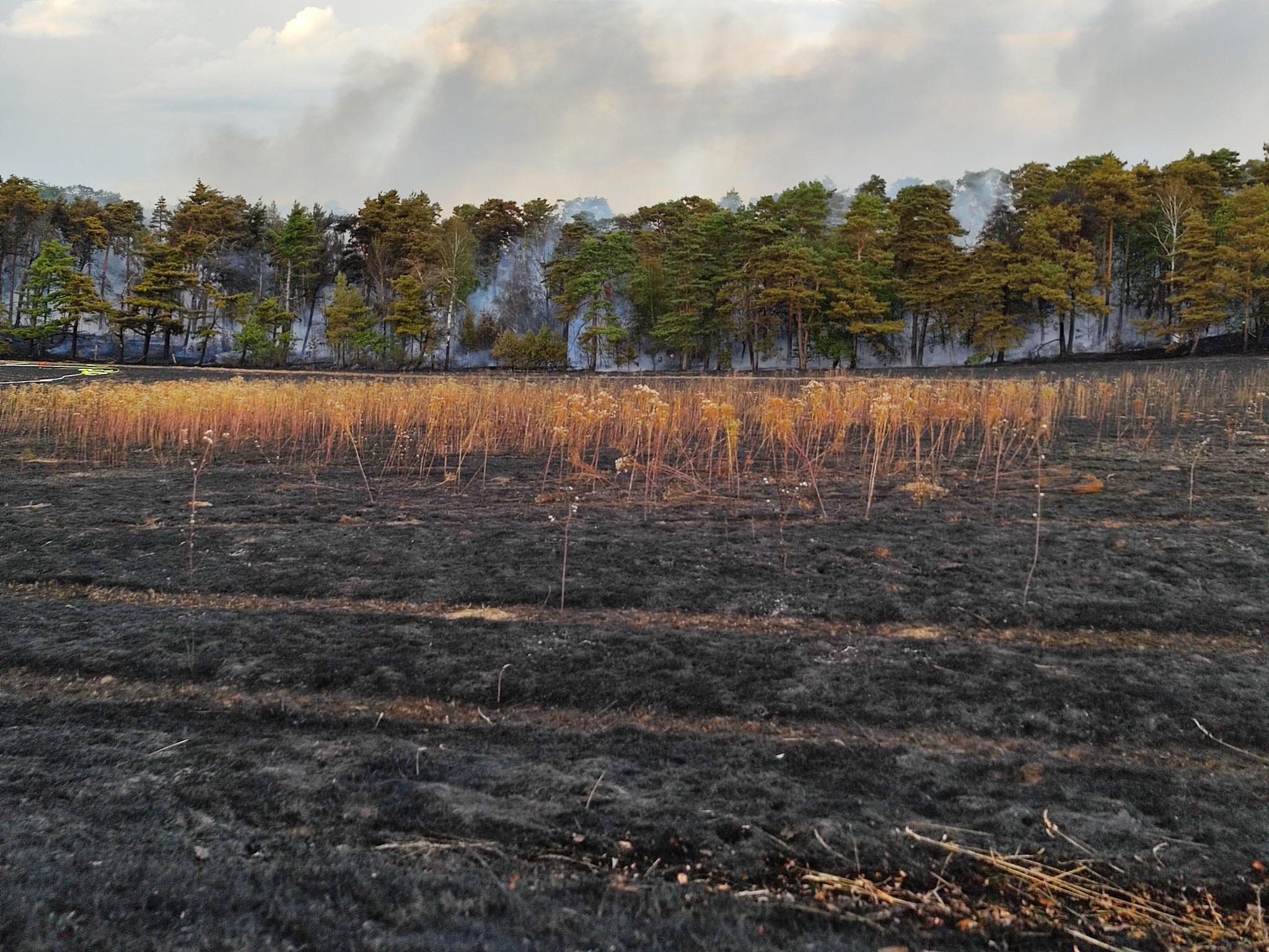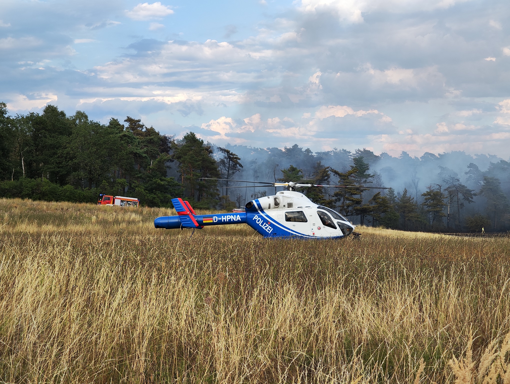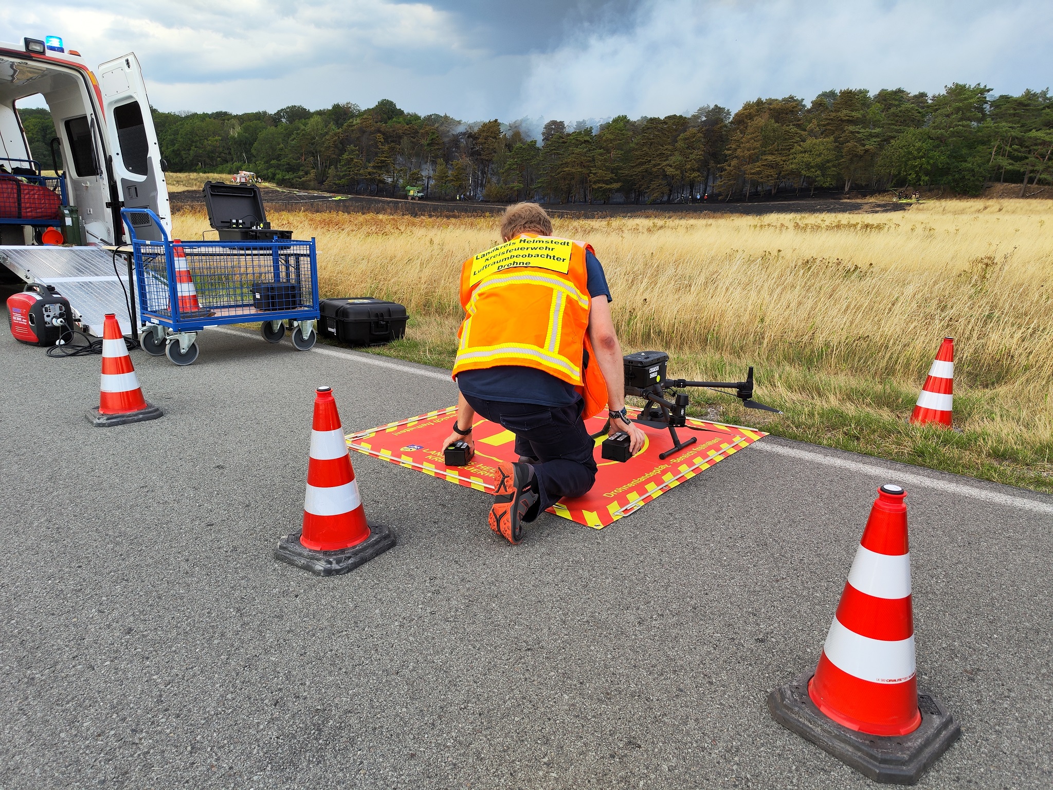 Neben den verschiedensten Wehren aus den umliegenden Dörfern war auch die Feuerwehr des Landkreises vor Ort. Ein Tanklöschfahrzeug des Flughafens Braunschweig-Wolfsburg sowie Feuerwehren aus dem Bereich Wolfsburg unterstützen ebenfalls. Später war auch die Schnell-Einsatz-Gruppe (SEG) des Arbeiter Samariter Bundes Helmstedt vor Ort. Die Helmstedter Kreisfeuerwehr flog das Gebiet mit einer Drohne ab, um sich ein Bild von oben machen zu können. Später traf auch ein Polizeihubschrauber ein, der den Einsatzleiter mit an Bord nahm um diesem einen noch besseren Blick zu gewähren. Landrat Herr Radeck und der neue erste Kreisrat Torsten Wendt machten sich ebenfalls ein Bild direkt vor Ort. Neben den zahlreich unterstützenden Landwirten aus der Umgebung, waren auch zwei Tanklaster der Firma Lang Mineralöle aus Sickte mit vor Ort. Beide Lastkraftwagen konnten mit Ihrer Saugdrucktechnik das Wasser der Tanks direkt in die Pumpen der Feuerwehrautos einspeisen, sodass das Löschen hier direkt unterstützt werden konnte. Beide LKW zusammen fassen ein Wasservolumen von insgesamt ca. 20.000 Liter Wasser. Es ist sehr schön zu sehen, dass die Gemeinschaft innerhalb und außerhalb des Landkreises Helmstedt sehr gut funktioniert und neben den unzähligen freiwilligen Feuerwehrkräften so viele Freiwillige aus der Zivilbevölkerung spontan geholfen haben. ![]() ![]() Auf Grund der langanhaltenden Trockenheit wird von einer erweiterten Einsatzlänge ausgegangen. Zwischen 18 und 19 Uhr drehte der Wind, sodass der Qualm in Richtung der Einsatzkräfte wehte. Immer wieder loderten auf dem aschebedeckten Waldboden Flammen auf. Vor Ort sind mehr als 200 Kräfte im Einsatz. Unter folgendem Link ist das Youtube-Video zum Einsatz zu sehen: ![]() ![]() ![]() ![]() ![]() ![]() ![]() ![]()